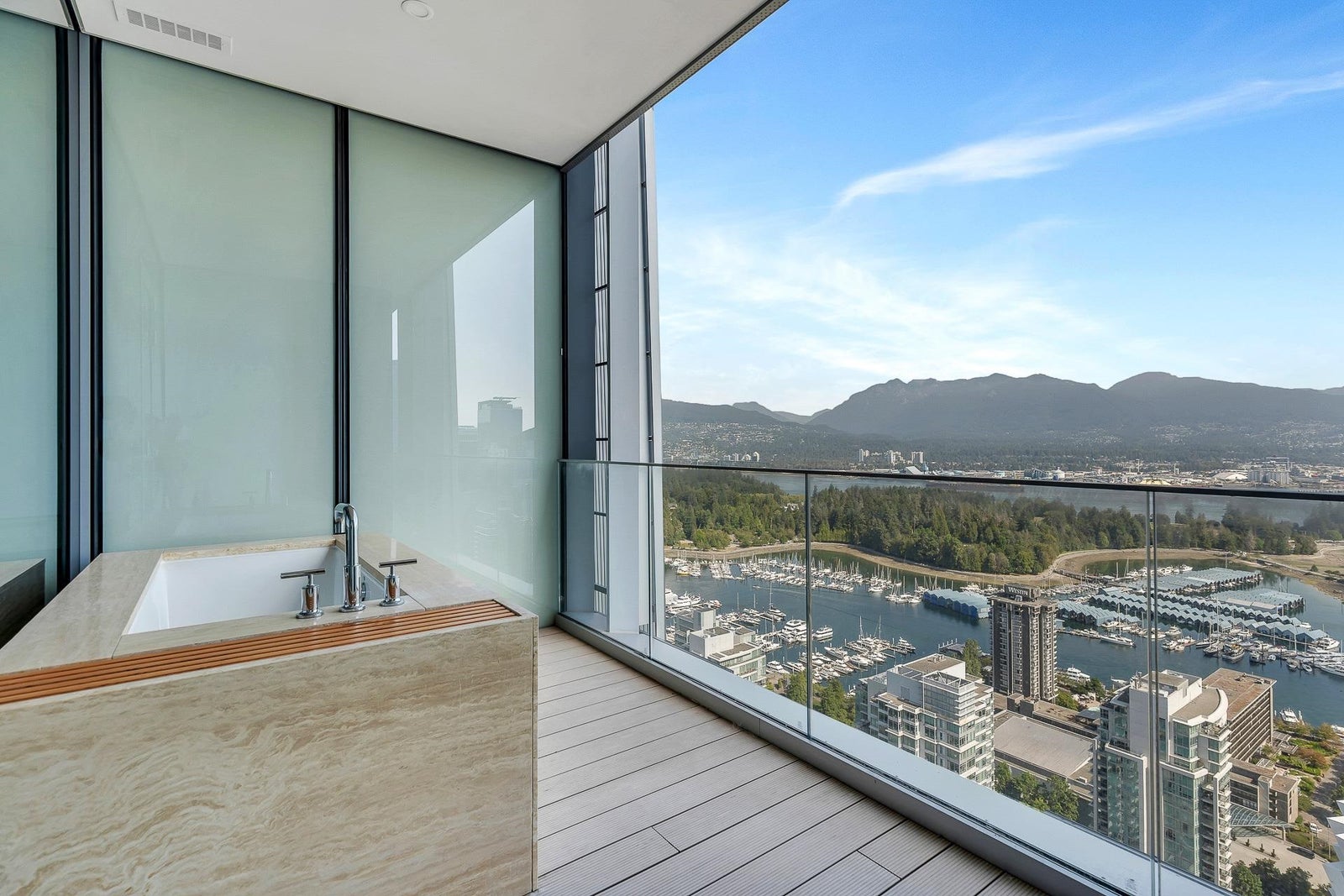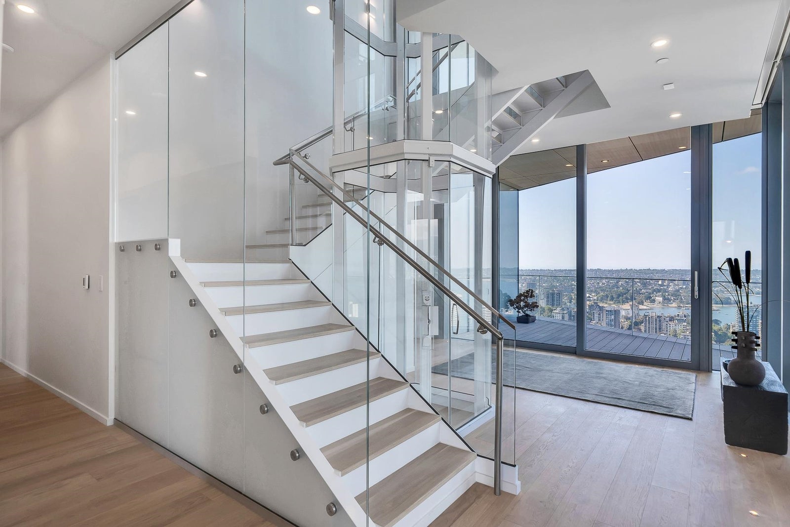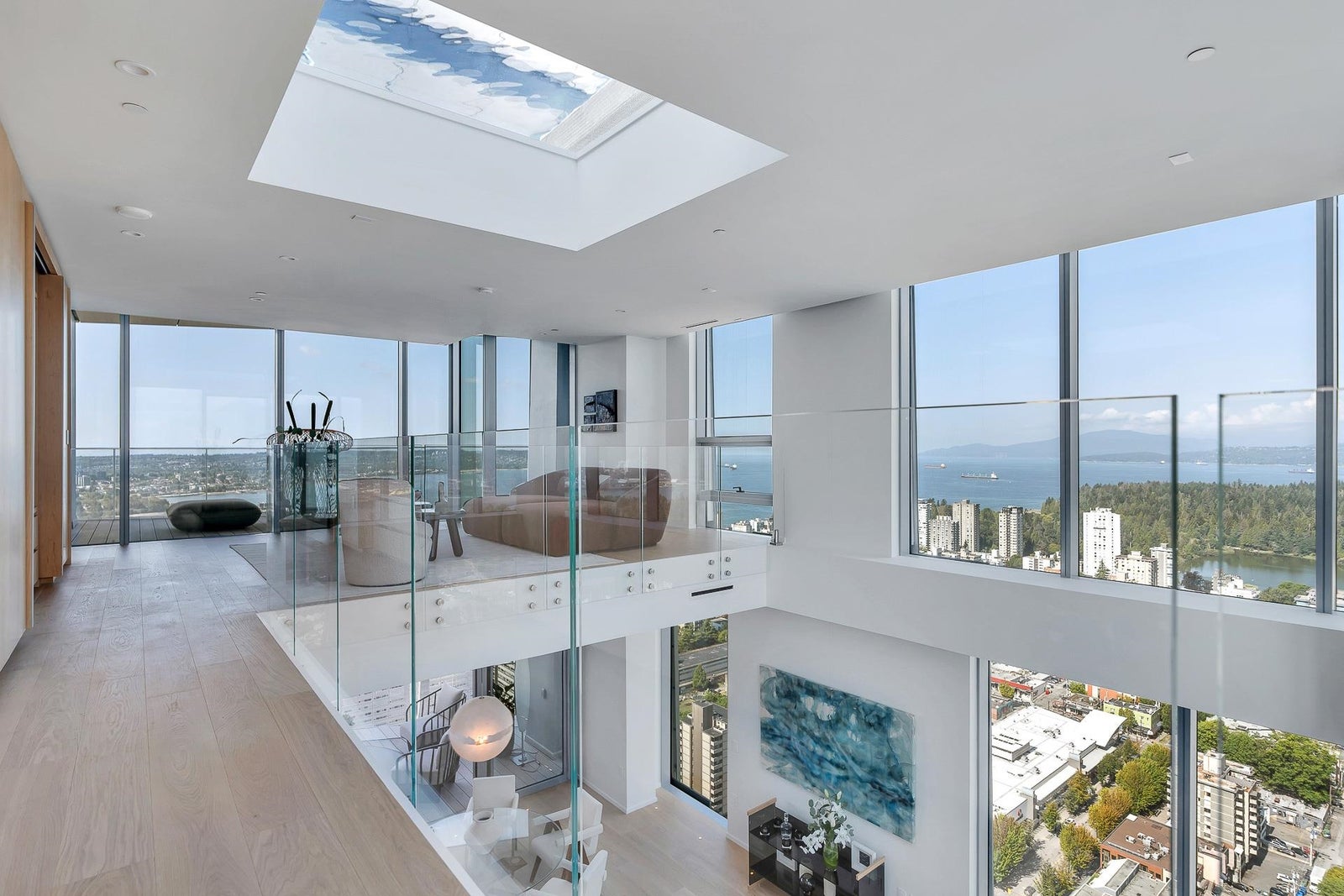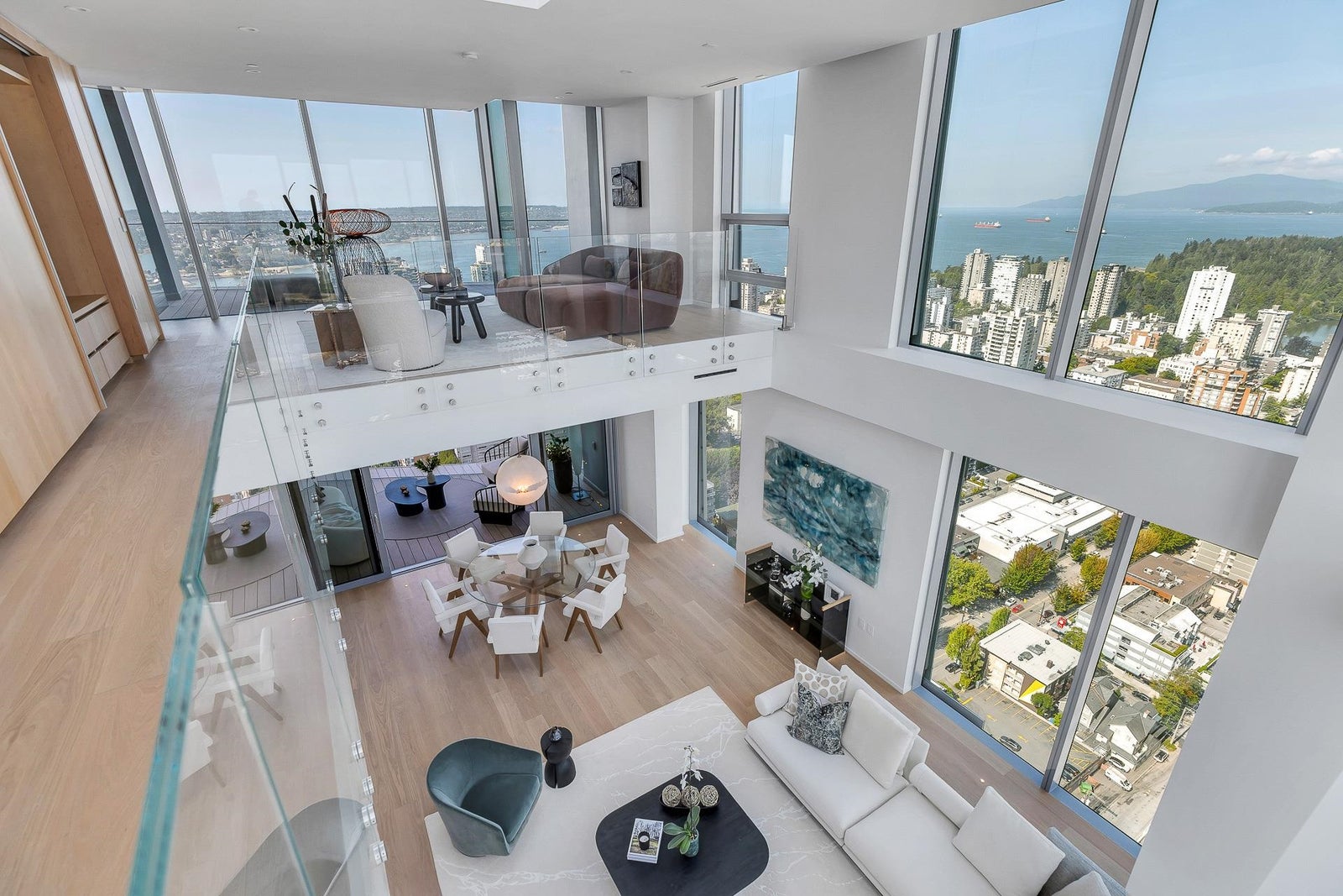 Arguably THE #1 View Penthouse in Vancouver! The Crown Jewel of "Alberni" by renowned Kengo Kuma. This spectacular skyhome is bathed in natural light and encompasses views - Coal Harbour, Mountains and English Bay. Simply stunning! The massive living and dining area with 20 ft ceilings sparkles like diamonds by the reflected light of the private glass bottom swimming pool & spa above. Ascend the open staircase clad in bleached white oak or the private glass elevator to one of the 3 huge outdoor terraces(total 2,283sqft). Int upgrades by Fruition Design exclusive to this home include: Brazilian "Laguna Bay" quartzite countertops, suede wallpaper, lighting by artist Enzo Catellani & Bocci. Primary bed w/outdoor soaker tub. 4 wine lockers, 2 DBL garages, 24/7 concierge world class amenities.